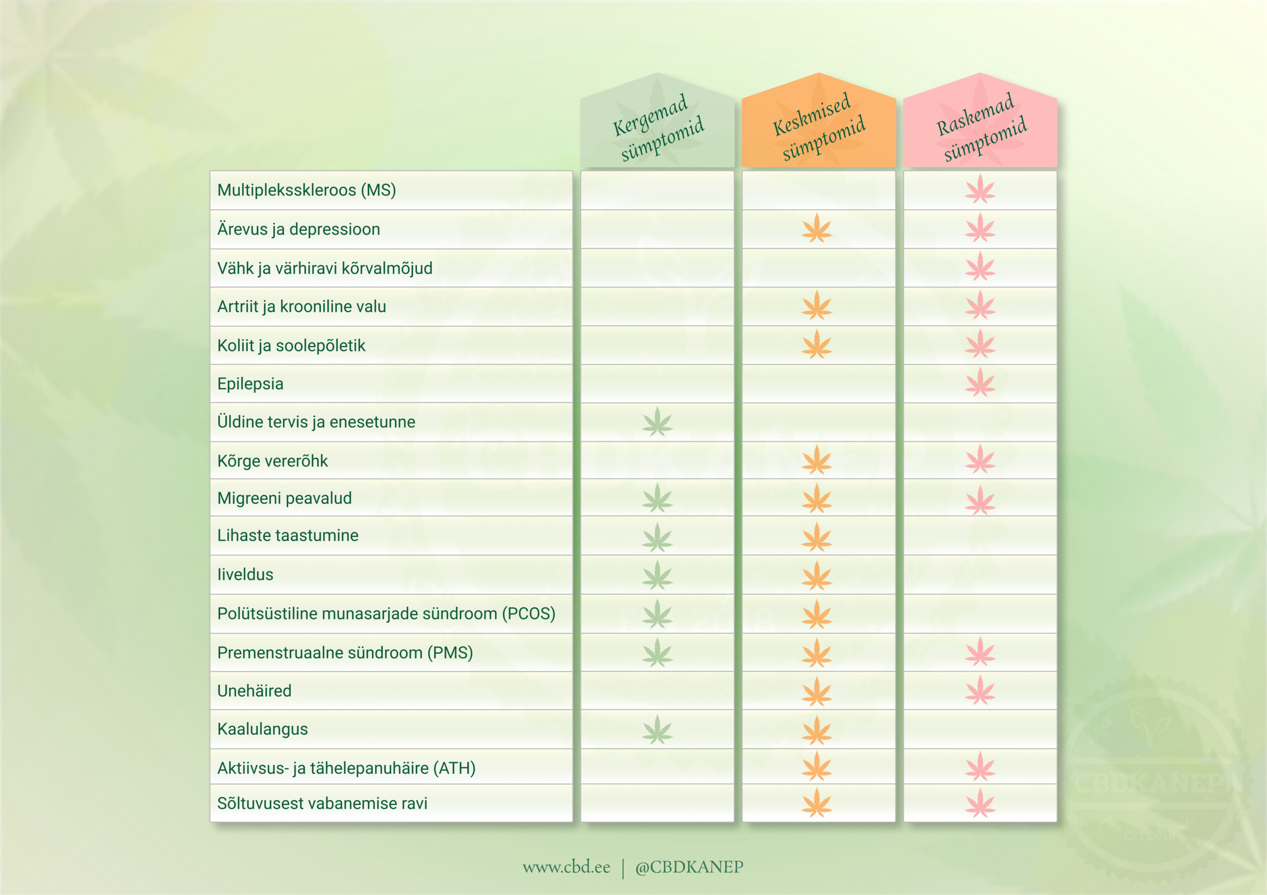 Inimesed kasutavad CBD õli selliste sümptomite/haiguste leevendamiseks (Tabel Süptomid):