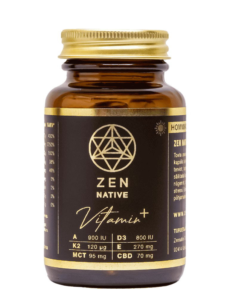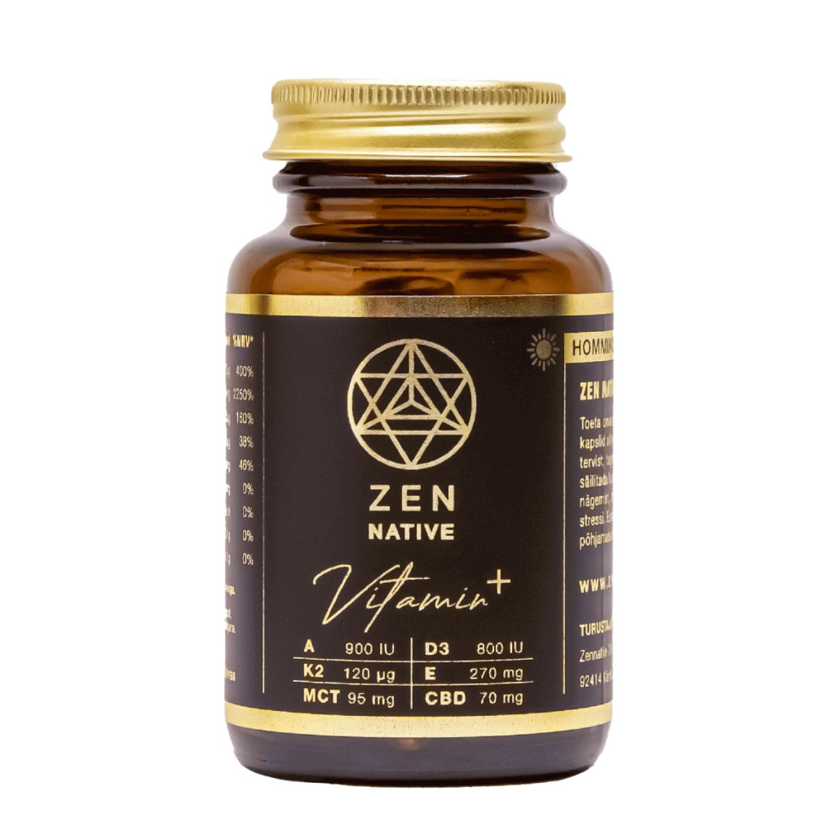 Zen Native Vitamin+ CBD kapslid on loodud hommikuseks kasutuseks, andes ühe kapsliga kõik päevaks vajalikud rasvlahustuvad vitamiinid ja CBD.